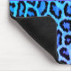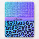 Ein exotischer, blauer und grüner Leopardendruck mit einem lila Band, in dem Sie ihn individuell gestalten können, um ihn einzigartig zu machen, mit einem farbenfrohen Blau und einem lila, ombre schattierten Quadrat für Kontrast. Tierische Chic-Villen.
