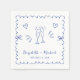 Trendy Hochzeitsnapkins für Ihre Verlobungsfeier, Probe Dinner, Empfang, etc., mit einem blauen gewellten Rahmen mit Kokettbogen, skurrilen handgezeichneten Herzenzeichnungen und toastenden Champagnergläsern, und den Namen der Braut und des Bräutigams in einem lustigen, spielerischen, handgeschriebenen blauen Drehbuch.