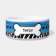 Niedliche Hundeschüssel mit einem trendigen blauen Zebrastreifen, einem schwarz-weißen Zebrastreifen, schwarzen Punkten und einem Hundeknochen mit dem Namen Ihres Hundes im Knochen.