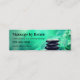 Massage Visitenkarten in einer kompakten doppelseitigen Visitenkartenvorlage mit schönem Design inklusive Zen-Steine und aquamarinen Tonhintergrund, der zwei Seitenaufdrucke enthält. Vorgestellt auf unserem "skinny Visitenkartenstock", der kompakter ist als herkömmliche Visitenkarten. Entworfen für einen Massagetherapeut, Physiotherapeut oder Masseuse.