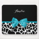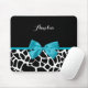 Eine schicke, schwarz-weiße Giraffe-Printmousepad mit einem trendigen aqua-blauen Band, das in einen gürlichen Bogen gebunden ist. Personalisieren Sie das süße Tier-Druckdesign durch Hinzufügen Ihres Namens. Flachdruckbild, nicht eigentlicher Bogen.