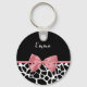 Ein trendiger, schwarz-weißer Giraffenprint-Schlüsselanhänger mit einem gürlich rosa Band, das in einem niedlichen Bogen befestigt ist. Personalisieren Sie dieses elegante Tierdesign, indem Sie Ihren Namen hinzufügen. Flachbild, nicht eigentlicher Bogen.
