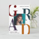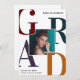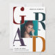 Absolute Liebe dieser trendigen Abschluss Foto-Ankündigungskarte Vorlage. Dieses hochwertige Design ist einfach zu personalisieren, um einzigartig zu sein. Laden Sie einfach Ihr Lieblingsbild hoch und passen Sie den Namen, das Jahr und den Namen der Schule, Collage oder Universität an. Modernes Design mit ausgeklügelter Farbkombination, um das Wort GRAD auszudrücken. Geeignet für Mädchen und Jungen Studenten - Feiern wir den Absolventen!