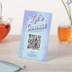 Trendy QR Code Tabelle Top-Zeichen mit holografischem Effekt Farbverlauf Hintergrund und Retro-Schriftart. Dieses moderne Social-Media-Podest-Zeichen enthält Platz für Ihren scannbaren QR-Code und Ihre Kontaktdaten. Das zarte Design und die pastellblauen und lila Farbtöne heben sich von Boutique, Schönheitssalon, Wellness-Center oder Büro ab. Einfach bewerben Sie Ihre Website, Social-Media-Konten wie Instagram, Ttiktok, Facebook mit diesem QR-Code-Zeichen.