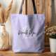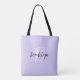 Diese elegante personalisierte Tasche mit Monogramm und Vorname in modernem Schwarz-Weiß-Script auf einem trendigen Lavendelhintergrund.