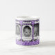 Eine moderne lila und schwarze Foto-Tasse mit einem trendy Leoparddruckmuster-Fotorahmen mit den niedlichen Lavendelbändern gebunden in Bögen. Personifizieren Sie, indem Sie 5 Baby-Fotos und -namen addieren.