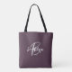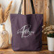 Diese elegante personalisierte Tasche mit Monogramm und Vornamen in modernem Grauton und Weiß auf einem lila Hintergrund aus trendigem Pflaume.