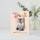Trendy Retro-Foto, Abschluss Ansage Postkarten, mit Designelementen Vintager Stil Typografie lesen "Grad" in boho Farben des Regenbogens. Das Foto der Absolventen wird durch dünne weiße Grenzen hervorgehoben. Hell pfirsichfarbene Korallenhintergrundfarbe oder einfach bearbeiten und ändern Sie die Farbe je nach Bedarf. Auf der Kartenrückseite finden Sie personalisierte Textstellen für Informationen über Ihren Abschluss. Perfekt für die Highschool, Uni und den Universitätsabschluss.