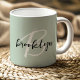 Diese elegante personalisierte Kaffee-Tasse zeichnet sich durch ein Monogramm und einen Vornamen in modernem Schwarz-Weiß-Skript auf einem sage-grünen Hintergrund aus.