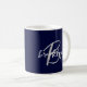 Diese elegante personalisierte Kaffee-Tasse zeichnet sich durch ein Monogramm und einen Vornamen in modernem silbergrauem und weißem Schrift auf marinebasischem Hintergrund aus.
