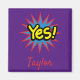 Ein trendiger Knopf für Straßenkunst, der mit "Ja" in schwarzer Kontur und einem roten und blauen Sternensymbol auf lila Hintergrund ausgestattet ist. Dein Name ist in lustigem rotem Schriftart geschrieben. Bestelle noch heute! Clipart: AnneIllustration https://www.etsy.com/shop/AnneIllustration