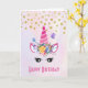 Eine glückliche Geburtstagskarte mit einer trendigen, rosa Einhornillustrierung mit einem Blumenkopfteil und den dortigen Schmetterlingen. Fake Goldkonfetti sprinkletterten oben entlang. Ein blasser lila und gelber Aquarellhintergrund. Personalisierte Nachricht an der Innenseite.