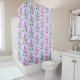 Duschvorhang mit sich wiederholenden Mustern. Die Einrichtung ist mit einem trendigen rosa Einhorn gestaltet. Mit einem extravaganten Blumenkopfteil verziert. Whimsikale Schmetterlinge fliegen herum.