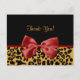 Vielen Dank an diese trendige schwarz-goldene Postkarte mit einem leoparden Druckmuster und einem eleganten bedruckten roten Band, das in einem Bogen befestigt ist. Bleiben Sie auf der Rückseite. Flachbild, nicht echtes Band.