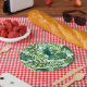 Trendy tropische Teller Design mit Aquarellmonstera, Banane und Palmen Blätter Illustrationen auf einem gestreiften Hintergrund.