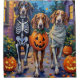 Adorable Treeing Walker Coonhunds, die in spielerischen Halloween-Kostümen gekleidet sind, tragen Kürbiseimer, während sie unter dem mondbeleuchteten Himmel tricksen oder sich behandeln. Dieses festliche Design hebt die Trikolour der Rasse, die Alarmbereitschaft und die abenteuerliche Persönlichkeit hervor, die perfekt die sprichwörtliche und dennoch lustige Atmosphäre Halloween-Abends einfangen. Eine charmante Feier für Treeing Walker Coonhound Liebhaber, Hundefreunde und Halloween-Fans gleichermaßen.