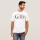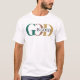 Dieser weiße T - Shirt zeigt deutlich die Phrase "GOTT IST GUT". Der Buchstabe "G" wird in einer aquamarinen grünen Farbe gerendert, das "O" in einem abgestuften Braun und das "D" in einem Senfgelb. Die Wörter "IS GOOD" sind kleiner und werden im "O" platziert, schwarz dargestellt.