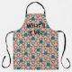 Diese Schürze hat ein geometrisches Design, in dem sich braun und braun wiederholende Dreiecke mit türkisfarbenen Kreisen oben auf einem weißlichen Feld befinden.