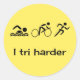 Schwarzer Text und Bilder auf einem hellgelben Aufkleber, Spaß für einen Triathleten. "I tri härter" Bildunterschrift mit Piktogramm Icons der drei Triathlon-Disziplinen.