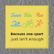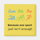 Ein lustiger und inspirierend Magnet für einen Triathleten. Der Text lautet "Weil ein Sport einfach nicht genug ist". Es gibt drei "swim bike run" Icons, um einen Triathlon in blau, grün und orange auf einem hellgelben Hintergrund darzustellen.