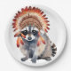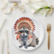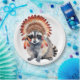 Eine bezaubernde Aquarell-Illustration eines Waschbads mit einer detaillierten Stammeshaube, geschmückt mit lebendigen roten und orangefarbenen Federn. Dieses Design verbindet die spielerische Neugier von Raccoons mit einer Touch von Böhmen und macht es zu einem idealen Ort für Naturliebhaber, Wildtierfreunde und alle, die die ästhetische Stammetik und die rustikale Ästhetik schätzen. Ideal für Bekleidung, Wohngestaltung und Accessoires, die eine einzigartige Verschmelzung von Wildnis und Kunst zeigen.