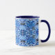 Tasse in einem Batik-Muster wiederholender Formen, mit einem Stammtisch inspirierten Thema, in Indigotönen und Himmelblau, auf weißem Hintergrund
