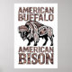 Eine stilisierte Schwarz-Weiß-Illustration einer amerikanischen Bison, die mit geometrischen Mustern geschmückt ist.