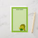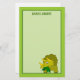 Dieses niedliche personalisierte Dinosaurierkinderbriefpapierpapier hat einen Cartoon Triceratops auf der Front. Es hat drei Hörner und isst irgendein grünes Blätter. Das Hintergrundpapier ist mit einer grünen Grenze grün.