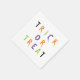 Trick oder behandeln bunt leckere Typografie Halloween lustige Party Papier Servietten. Schwarz, Orange, Grün, lila, farbenfrohe Typografie, weißer Hintergrund. Erhältlich in verschiedenen Hintergrundfarben.