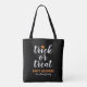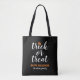 Diese beängstigenden niedlichen Halloween-Tasche / Bonbons sind mit "Trick or Treat" in einem modernen, weißen Drehbuch mit einem orangen Jack o'lantern Kürbisakzent und schwarzer Hintergrundfarbe ausgestattet.