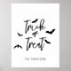 Feiern Sie Halloween im Stil mit diesem modernen Poster mit Trick oder Treat in schwarzer Schrift-Typografie mit spielerischen Fledermaus-Silhouetten auf weißem Hintergrund. Mit einem personalisierbaren Textbereich können Sie einen Familiennamen, Gruß oder eine benutzerdefinierte Nachricht hinzufügen, sodass es ein einzigartiger und festlicher Akzent für Ihren Zuhause-, Klassenraum- oder Party-Bereich ist. Das minimalistische Design bringt eine stilvolle und zeitgenössische Touch in Ihr stilvolles Dekor der Saison.