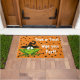 Ein lustiges Halloween-Doormat mit einem albernen grünen Frosch in einem Hexenhut mit der Phrase "Trick or Treat, Wipe Your Feet!" auf einem orangefarbenen Polka-Dot-Hintergrund. Eine spielerische und familienfreundliche Art, um Trick-oder-Wächter und Gäste willkommen zu heißen und gleichzeitig den Saisoncharakter Ihres Eingangs oder der Veranda zu erhöhen.