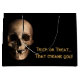 Skull auf schwarzem Hintergrund mit "Trick or Treat...Das heißt dir!" in goldener Schrift. Sehr große Süßigkeitstasche mit Griff.