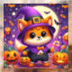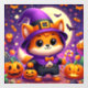 Dieses hübsche Bild zeigt einen zu Halloween gekleideten Cartoon-Fuchs. Der Fuchs trägt einen lila Zauberhut mit einem goldenen Schnürchen und einem passenden lila Kap über einem schwarzen Anzug mit einer Krawatte aus Bogen. Es hält einen Bonbons in der einen Hand und einen Kürbiseimer in der anderen, bereit für Trick oder Behandlung. Der Hintergrund ist eine lebendige Nachtszene mit Vollmond, Fledermäusen, Sternen, Kürbissen und festlichen Dekorationen. Die großen, ausdrucksstarken Augen und das niedliche Lächeln des Fuchses machen es unmöglich, keine Liebe zu haben.