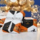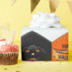 Schwarz, Weiß und Orange-Hexagons mit Halloween-Elementen, Hexenleder, Jack-o-Laternen und Happy Halloween-Zeichen. Kontrast Farben Halloween-Design mit Hexagons Abzeichen und Trick oder Treat Linie. Personalisieren Sie das Programm durch Ändern oder Entfernen von Text und Abzeichen.
