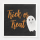 Black Hallowe’en paper napkins mit "Trick or Treat" in einem orangefarbenen Flowy-Skript und einem freundlichen Geist, der von der Seite hereingeguckt wird.