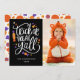 Teilen Sie feierliche Grüße mit dieser niedlichen Halloween-Karte mit der Phrase "Trick or Treat Y’all" in weißem, handgeschriebenem Drehbuch, umgeben von bunten Halloween-Süßigkeiten, Sternen und Punkten in Orange-, lila- und Gelbtönen auf schwarzem Hintergrund. Personalisieren Sie die verspielte Halloween-Karte mit Ihrem Familiennamen, dem Jahr und einem Foto. Die Rückseite zeigt ein passendes buntes Süßigkeitsmuster für ein lustiges und zusammenhängendes Design.