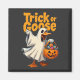 Funny Halloween goose in a spooky ghost costume with a pumpkin bucket full of candy. Perfect for humor-loving fans of Halloween and mischievous birds.