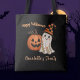 This charming (and slightly scary) faux embroidered Black and Orange Trick and Treat Tote Bag is a charmer -- with a friendly ghost hovering next to and happy pumpkin -- both well dressed for their special evening. With Fun script for "Happy Halloween" and personalized with the trick-or-treater's name, this will make a wonderful accompaniment for Halloween Eve. Any design questions, just send a message or an email to charmdesignstudio@rcn.com and we'll be delighted to assist.