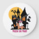 A charming and spooky Halloween illustration featuring a cute ghost wearing a pink cowgirl hat, riding a small brown pony in front of a silhouette of a haunted house under a glowing full moon. The text below reads "TRICK OR TROT". The scene also includes silhouetted bats, a witch flying on a broomstick, and two floating ghosts, combining Western flair with traditional spooky elements.