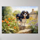 Tribfarbene Cavalier King Charles Spaniel mit farbenfrohen Blume im Garten