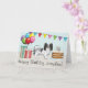 Desteis originelle Cartoon-Illustration einer Tricolor-Fell Farbe Papillon Rasse Hund. Der Hund ist in einer bunten Geburtstagslandschaft untergebracht. Es gibt einen Geburtstagskuchen mit ein paar Kerzen darauf, bunte Geburtstagsballons und ein buntes Banner sowie zwei Geschenkschachteln. Es gibt auch einen personalisierbaren Textbereich.