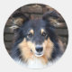 Schöne Trikolore-Sheltie oder Shetland Sheepdog-Gesicht auf einem farbenfrohen Backsteinhintergrund Hundeliebhaber Aufkleber