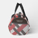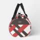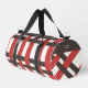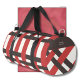 Retro woven pattern in three colors. Red and brown lines on an almost white background. Brown areas on the sides offer space for your name, slogan, or motivational quote. Classic colors for your retro-style travel bag.