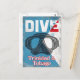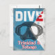 Trinidad & Tobago Karibik Vintage Scuba Maske Reise Poster Design. Ein blau-weißer Taucherhintergrund mit einer Retro-Tauchmaske und dem Wort "Dive" oben.