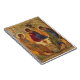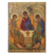 vintage art with mediaeval christian painting by andre rublev of his interpretation of the trinity with three angels with golden wings sitting together around a table with a golden bowl.