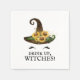 Ideal für Ihren Halloween-Party- oder Halloween-Junggeselinnen-Abschied. Es ist mit einer niedlichen Hexenwand versehen (ein rustikaler Hexenhut, der mit einem Blumenstrauß über schwarzen Wimpern geschmückt ist). Unten steht der schwarze Text "Trink auf, Hexen!" in einem passend gruseligen Schriftart.