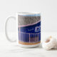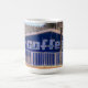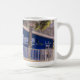 Drink KAFFEE schlafen später - In abgenutzten weißen Buchstaben auf einem kobaltblauen Hintergrund gemalt auf einer Ziegelwand, das Schild in der Originalaufnahme auf dieser Tasse des Kaffees sagt es alles für Kaffeeliebhaber. Die kleine Boutique mit einer Palme vor dem Haus und einem Strohdach dahinter lädt zum Verweilen bei Sonnenlicht am Nachmittag ein.