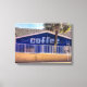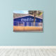 Drink KAFFEE schlafen später - In abgenutzten weißen Buchstaben auf einem kobaltblauen Hintergrund gemalt auf einer Ziegelwand, das Schild in der Originalfotografie von ZoeSPEAK auf dieser Canvas Print sagt alles für Kaffeeliebhaber. Die kleine Boutique mit einer Palme vor dem Haus und einem Strohdach dahinter lädt zum Verweilen bei Sonnenlicht am Nachmittag ein.