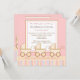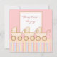 Dreimal die Freude! Die ist die Mitteilung auf dieser Babypartyeinladung, die drei entzückende Kinderwagen mit den rosa, blauen, gelben und braunen Streifen auf einem rosa Hintergrund kennzeichnet.